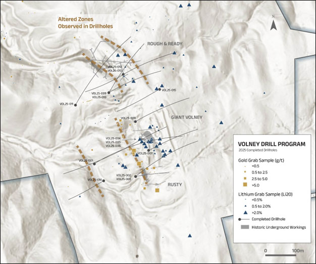 - Spodumene-bearing Pegmatite Intersected: Spodumene has been identified in multiple pegmatite intercepts in the Giant Volney and Rough & Ready mine areas. Drillhole VOL25-009 intercepted two spodumene-bearing pegmatite zones from 48.3 to 76.9 m and from 103.5 to 120.3 m. These pegmatites occur near areas of previous surface sampling that returned up to 3.6% Li2O and are consistent with mapped pegmatite system in the Volney target area (see Lion Rock news release dated May 13, 2025). Cassiterite and tantalite have also been observed in drill core.